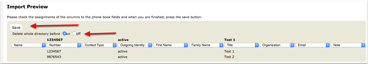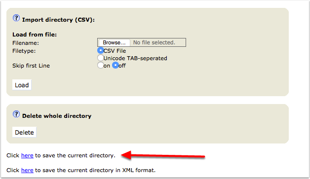 Once you have added all the names and numbers required. You can export these and import in to another phone. To Export your address book, choose the html link on the word here as below on the Click here to save the current directory