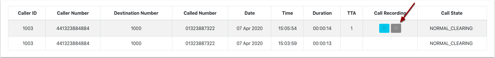 Under Call Recording you can see we have 2 icons. One to play and the other to download the recording. Click the download button.