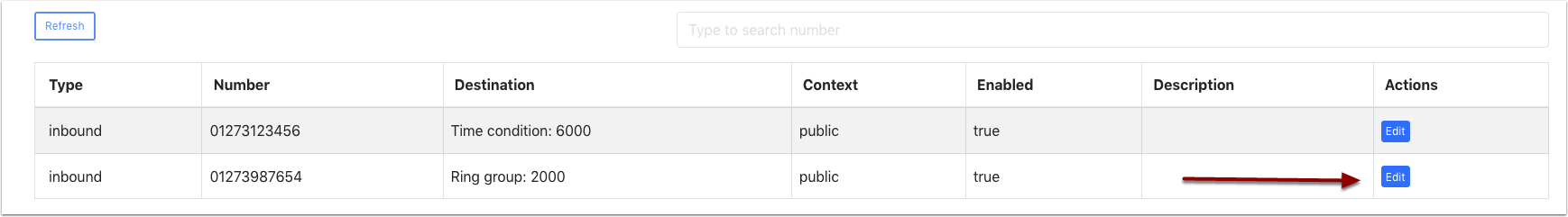 Here we have 2 numbers. The 1st goes to a time condition and out 2nd goes to a ring group. Let's update the 01273987654 but choosing the edit button.