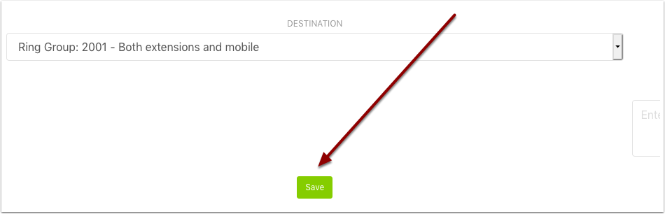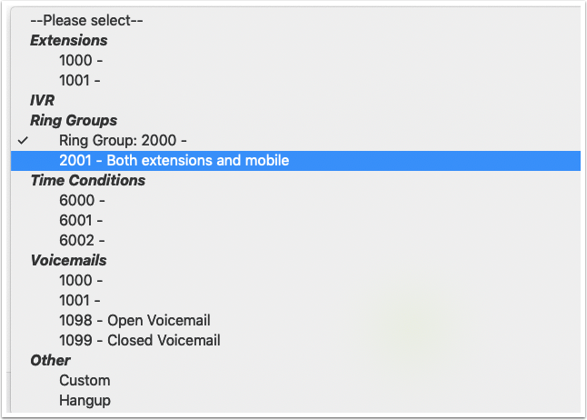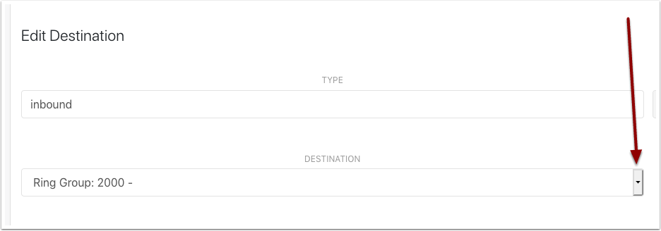 Currently you can see our destination is Ring Group 2000. Click the arrow to choose from the drop down.