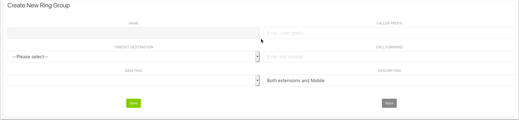 Here we have a few fields to fill in. The name will be auto generated, our 1st ring group will be named RG2000 and each after that will be incremented by 1, EG RG2001. Timeout Destination allows us to send the call somewhere else if not answered. Call forward allows you to send the whole ring group to a destination of your choice, ie a mobile number. The greeting field allows you to play a recorded message to customers before ringing extensions. Let's give this a description so we can identify it later.