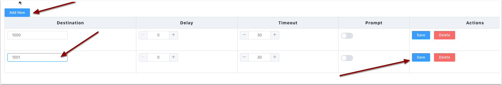 Now we will add our 2nd extension 1001. Click the Add New button again. Enter 1001 in the destination and then click save.