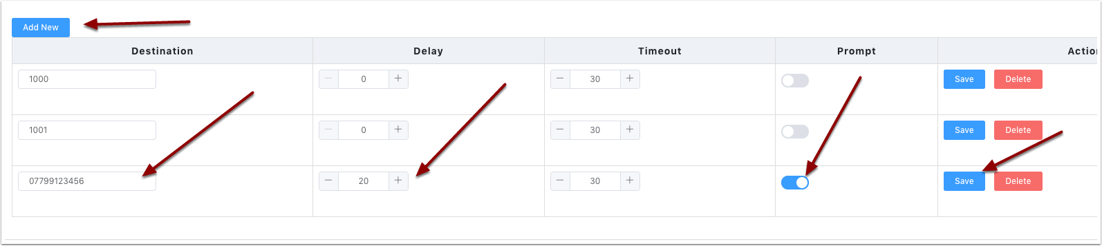 Lets start by adding our 1st extension 1000 to ring. We will go through the settings available further down in the instructions. Enter 1000 in the destination and then click save.