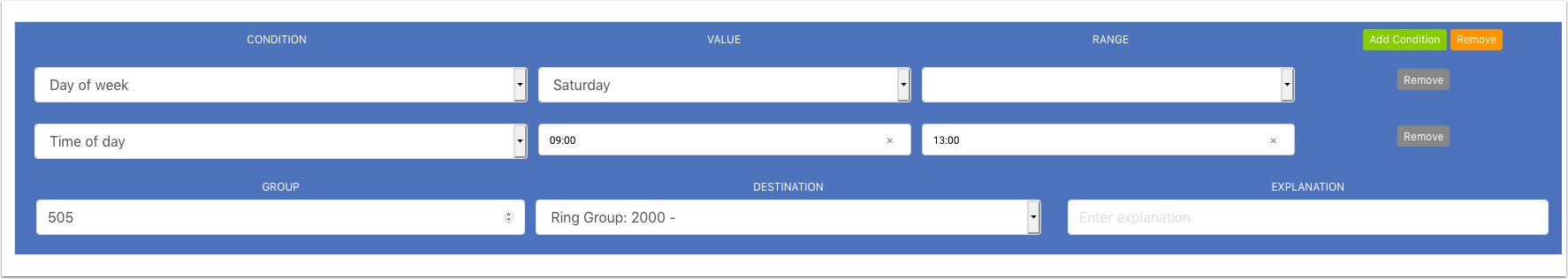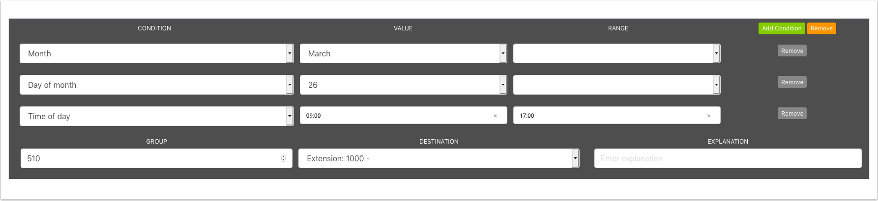 You will notice that below our last created Saturday a new condition will appear. I have added the condition as below for the day we want the calls to just go to extensions 1000 as below. Here is the important part about the Group. As this is now our 3rd condition the group was automatically set as 510. If we left this as it is the call would not go to extension 1000 on the 26th March because the conditions above it match 1st and as it's a Thursday the calls will go to ring group 2000.