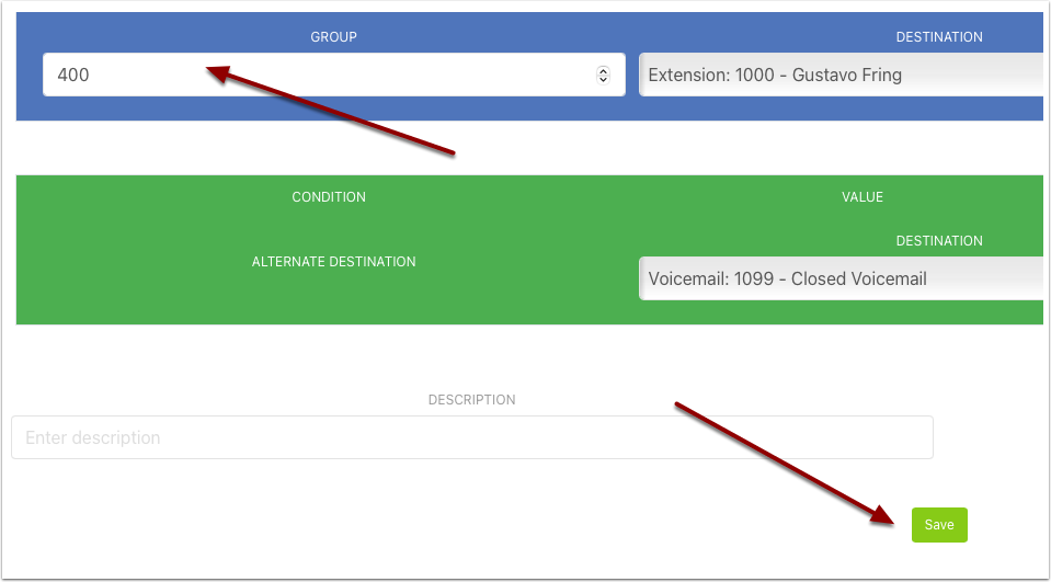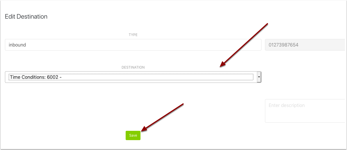We change our Destinations from RG2000 to our Time Condition 6002 and click save. That's it the time condition is live.