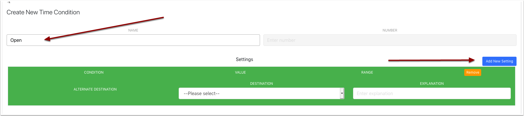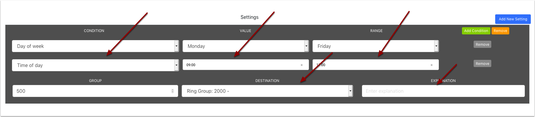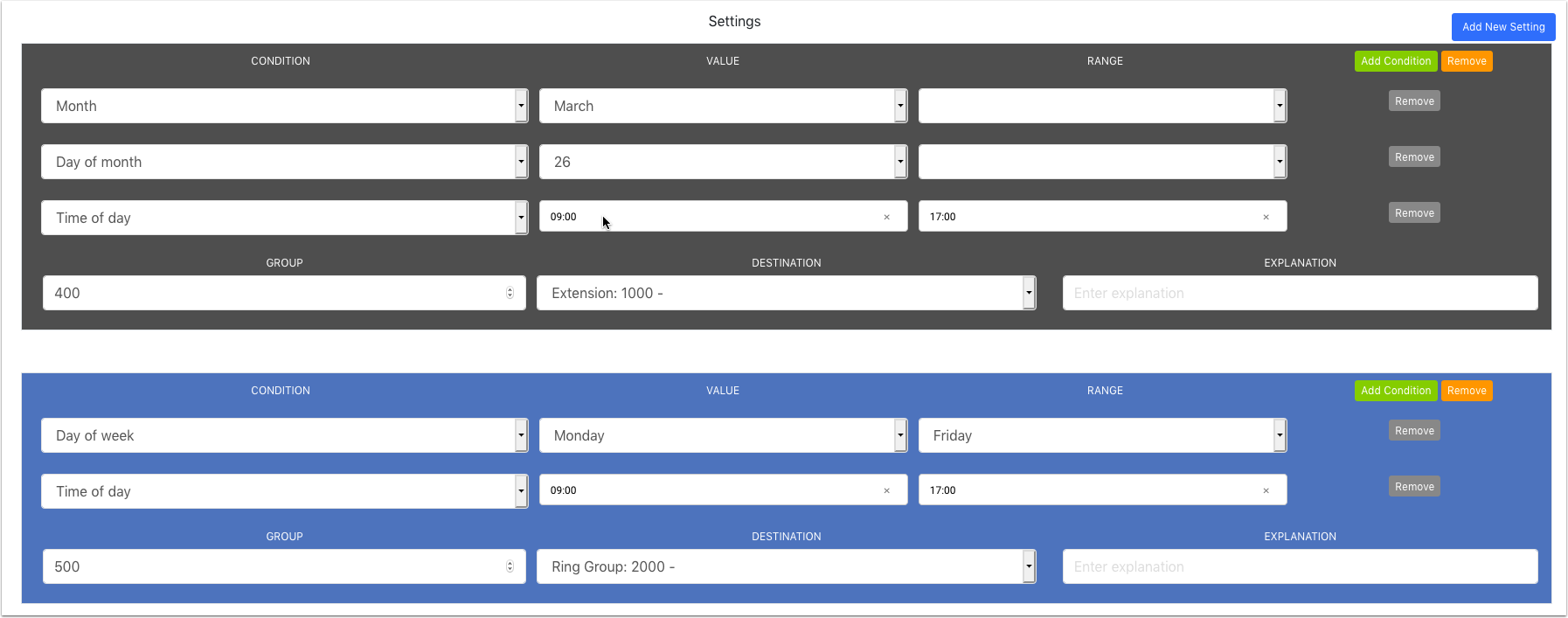 Now lets say for today only we want calls to go to just extension 1000. We can add this to the time condition so we don't need to remember to add or remove. So click the Add New Setting button.