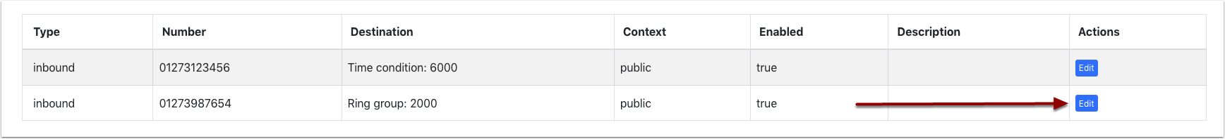 Here we are going to edit out 01273987654 as this does not have a time condition. Click the Edit button to the right of the number.