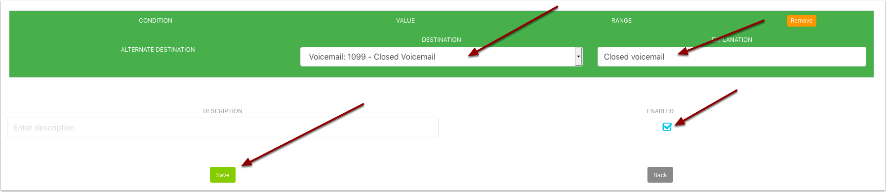 We now need to tell the system what to do with calls outside our time condition, this is the Alternative Destination section. We have an out of hours voice mail which we will use in our example. In Destination we choose Closed voicemail and give an explanation if you require. At the bottom you can also add a description for the time condition. Once completed make sure the Enabled box is ticked and click the save button.